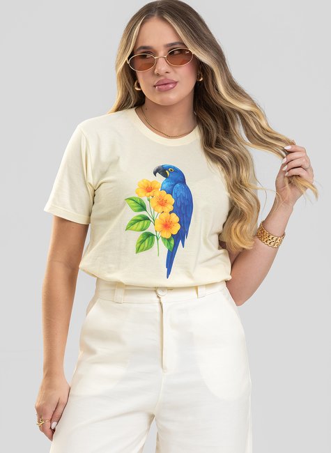 Eleve seus looks com a delicadeza e o charme tropical desta camiseta feminina. A peça traz uma linda ilustração de arara azul combinada a flores amarelas vibrantes, resultando em um visual artístico, colorido e super elegante.