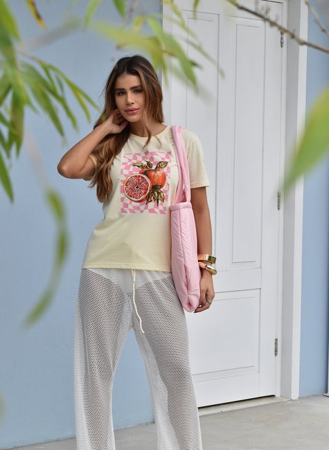 O modelo na cor amarelo suave ganha destaque com a estampa vibrante de laranjas em estilo ilustrado, sobre um fundo xadrez rosa em mood retrô que transmite frescor e personalidade. Ideal para quem ama composições modernas, alegres e versáteis.
