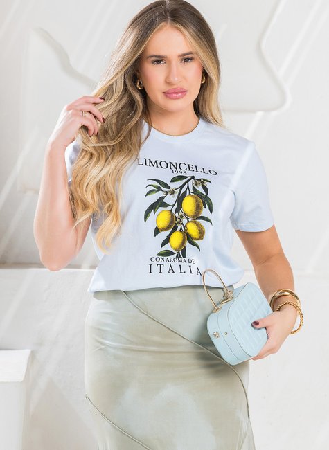 Refrescante e cheia de charme, a Camiseta Feminina Limoncello é perfeita para quem ama um visual leve e delicado. Confeccionada em tecido macio e confortável, ela possui modelagem soltinha, gola redonda e mangas curtas. A estampa com ilustração de limões traz um toque mediterrâneo e romântico, inspirando aquele clima de verão na Itália.
