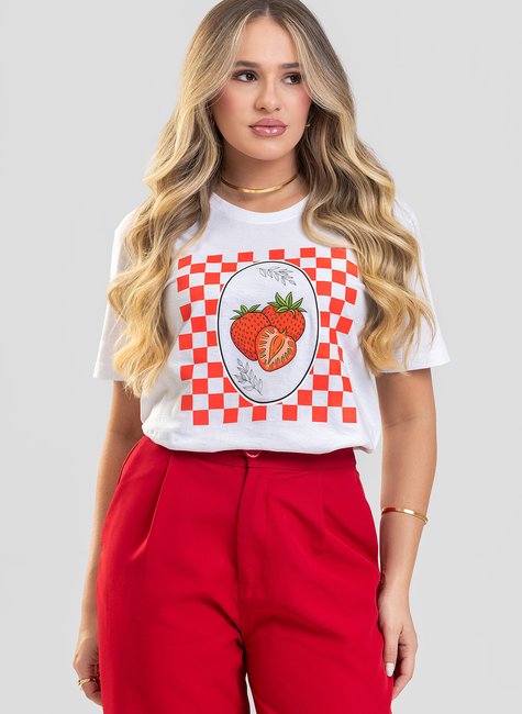 Camiseta feminina confeccionada em malha premium 100% algodão, oferecendo toque macio, leveza e conforto para o uso diário. Possui estampa frontal de morangos com moldura oval e fundo xadrez, trazendo uma proposta divertida, retrô e cheia de personalidade.