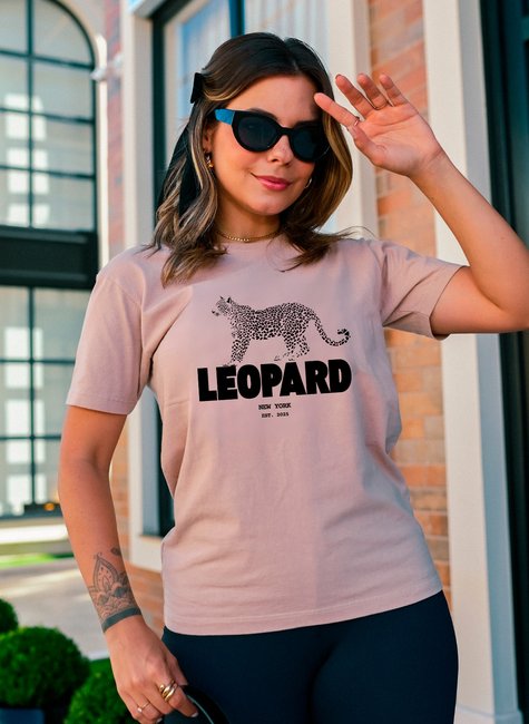 A estampa frontal traz um leopardo com visual moderno e urbano, acompanhado da palavra LEOPARD em destaque e o toque cool de New York – Est. 2025.