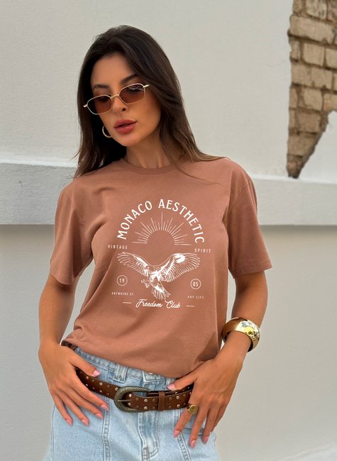 A camiseta Monaco Aesthetic traz uma estampa imponente de águia com design retrô e toque sofisticado, ideal para mulheres que expressam sua autenticidade através da moda. A cor marrom claro complementa o visual com elegância e versatilidade.