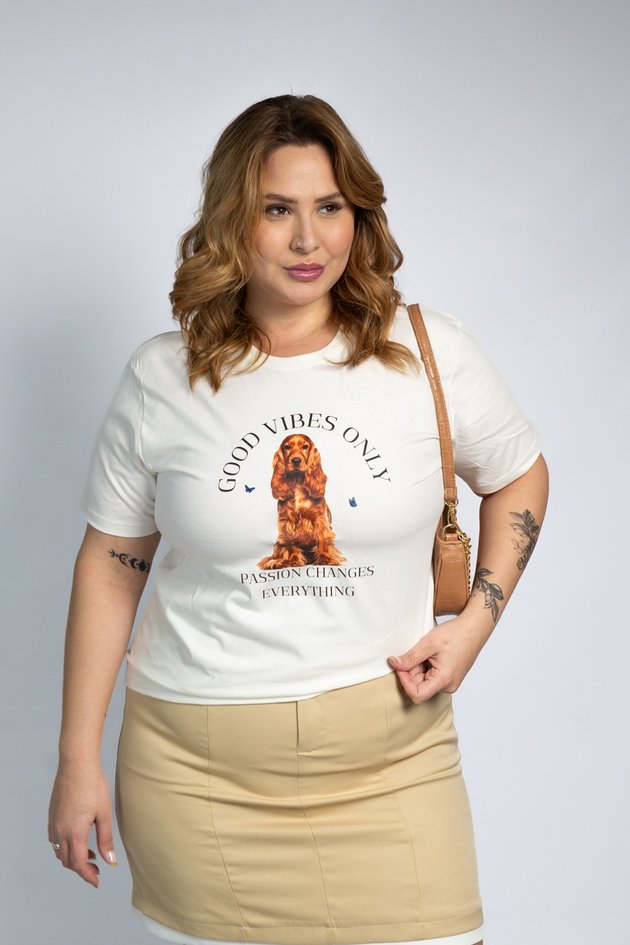 Essa camiseta une estilo e fofura com uma estampa encantadora de um cachorro cocker spaniel, borboletas delicadas e frases inspiradoras: “Good Vibes Only” e “Passion Changes Everything”. Uma peça para quem ama espalhar boas energias por onde passa!