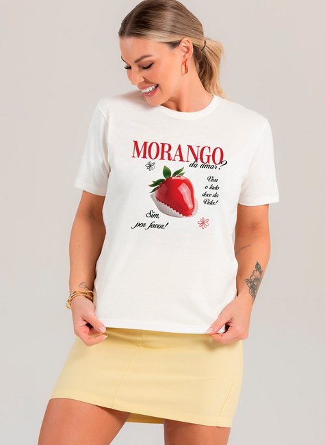 Delicada, divertida e cheia de personalidade, esta camiseta feminina off-white traz a estampa charmosa de um morango coberto de chocolate com a frase “Morango do amor? Sim, por favor!”. Um toque romântico e bem-humorado para seus looks do dia a dia.