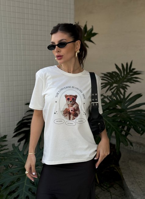 Essa camiseta traz uma estampa criativa e inspiradora com uma onça estilizada usando óculos e segurando uma caneca "Powerful", acompanhada da mensagem motivacional: "The Universe is on my side". Ideal para mulheres que amam moda com propósito e personalidade.