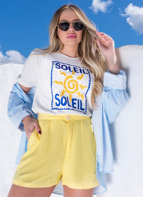 A Camiseta Feminina Soleil traz uma proposta leve, moderna e cheia de energia. Confeccionada em tecido macio, ela possui modelagem soltinha, gola redonda e estampa frontal em estilo artístico, com desenho de sol estilizado e lettering em azul e amarelo — uma combinação que transmite vibração solar e clima de verão.