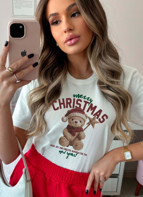A estampa apresenta um urso fofo com gorro natalino, segurando uma varinha com estrela, acompanhado da frase Merry Christmas. Uma composição moderna, afetiva e cheia de charme — perfeita para quem ama um visual natalino leve e estiloso.