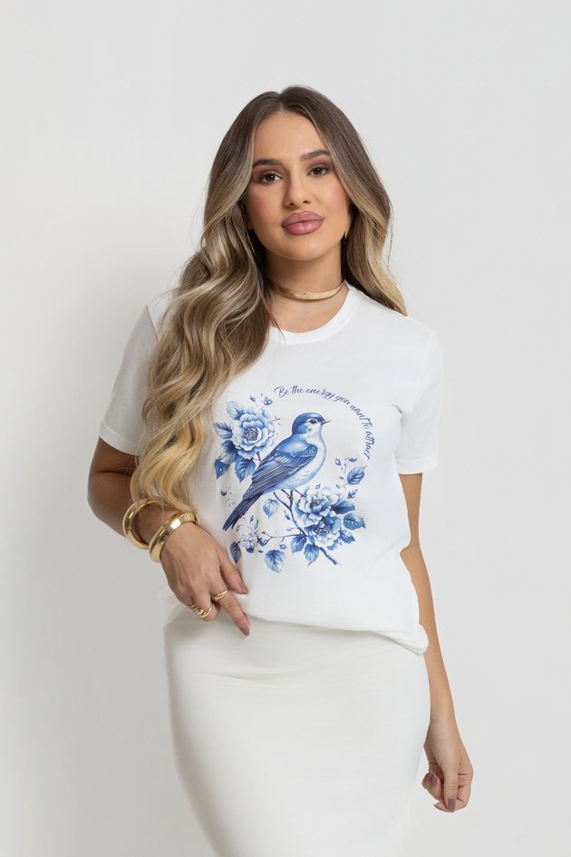 A camiseta feminina Be The Energy combina elegância e leveza em um design encantador. A estampa exclusiva apresenta um delicado pássaro azul envolvido por flores em tons suaves, acompanhado da frase inspiradora “Be the energy you want to attract”, transmitindo uma mensagem positiva e cheia de significado.