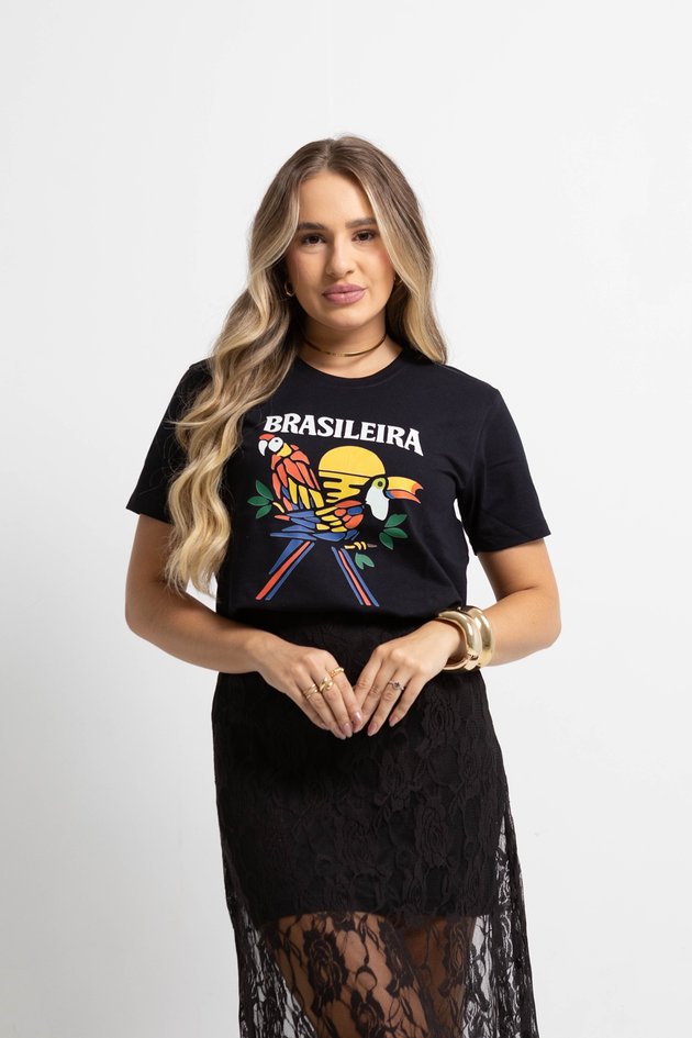 Cheia de cor e personalidade, a Camiseta Brasileira celebra a beleza e a energia do Brasil. A estampa traz araras e tucano em cores vibrantes, acompanhados do pôr do sol tropical e da escrita “Brasileira”, criando um visual alegre, moderno e cheio de identidade.