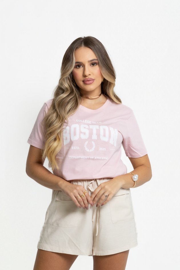 Com estampa frontal em lettering clássico “Boston – College Team”, o modelo ganha um ar moderno e sofisticado, enquanto o tom rosa claro adiciona delicadeza e feminilidade à produção. A gola redonda e as mangas curtas garantem versatilidade, permitindo diversas combinações — do casual ao urbano chic.