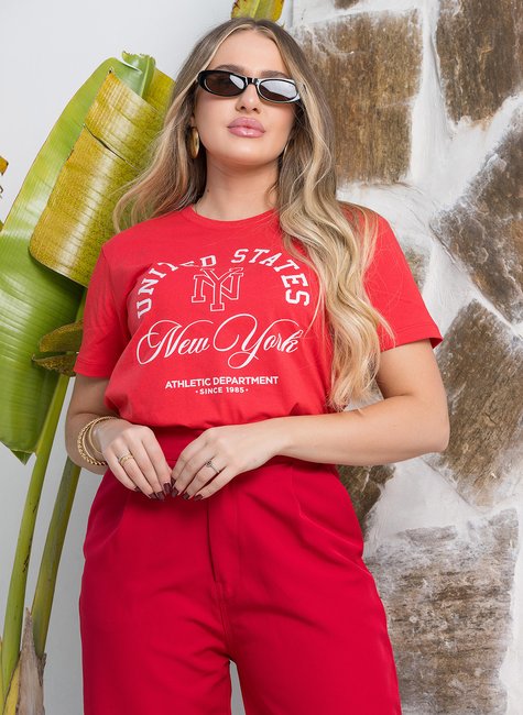 A Camiseta Feminina New York é perfeita para quem ama um visual moderno, urbano e cheio de personalidade. Confeccionada em tecido macio e confortável, ela possui modelagem soltinha, gola redonda e estampa inspirada no estilo college americano, trazendo referência ao universo esportivo e à cidade de Nova York.